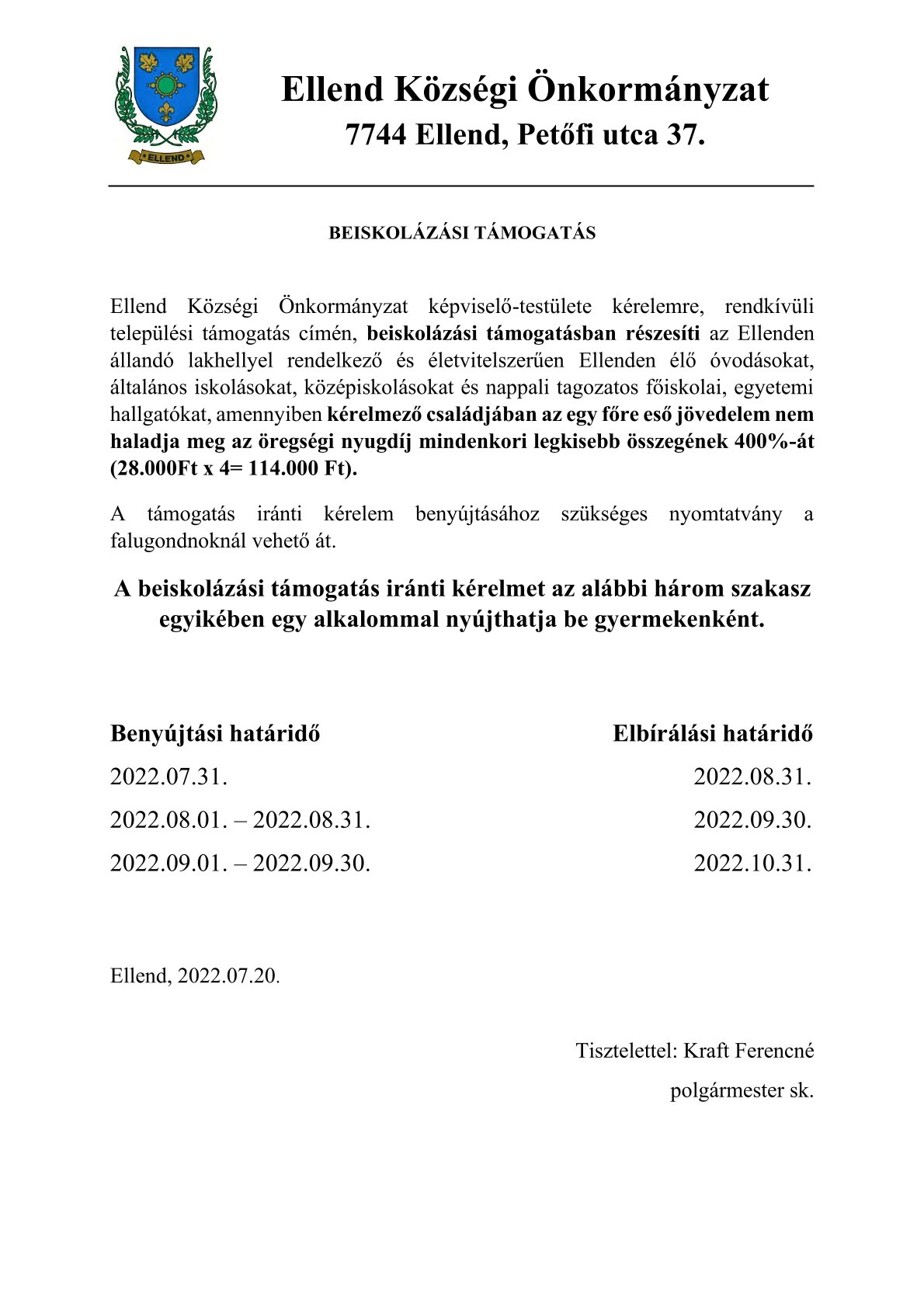 Ellend Község Önkormányzata a Kulturális és Innovációs Minisztériummal együttműködve, a felsőoktatásban részt vevő hallgatók juttatásairól és az általuk fizetendő egyes térítésekről szóló 51/2007. (III. 26.) Kormányrendelet alapján