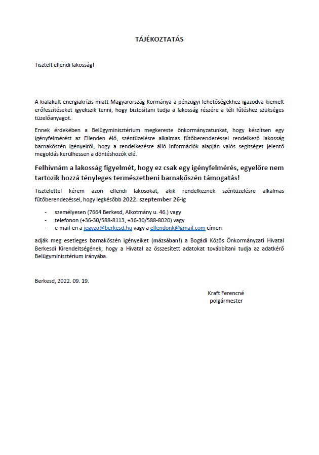 Bevallási nyomtatvány ügyfélfogadási időben a Bogádi Közös Önkormányzati Hivatal Berkesdi Kirendeltségén átvehető illetve a www.ellend.hu weboldalról letölthető.